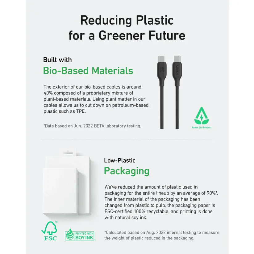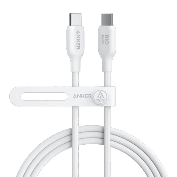 Cable Anker 544 USB-C a USB-C Biobased en color blanco, diseñado para carga rápida y transferencia estable. Fabricado con materiales más sostenibles, ofrece alta resistencia, durabilidad y compatibilidad con teléfonos, tablets y laptops con puerto USB-C. Ideal para uso diario con calidad premium.